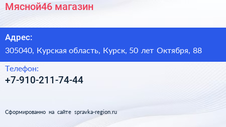 Мясной46, магазин по адресу 305040, Курская область, Курск, 50 лет Октября, 88 в дальнейшем Организация, размещена в следующих категориях: