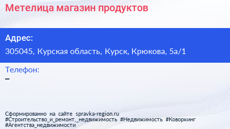 Метелица, магазин продуктов по адресу 305045, Курская область, Курск, Крюкова, 5а/1 в дальнейшем Организация, размещена в следующих категориях: