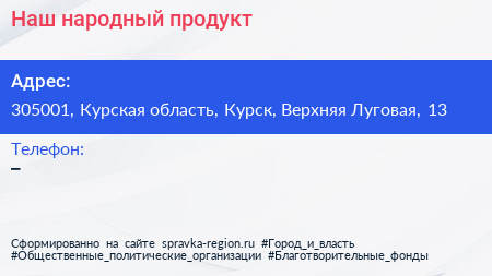 Наш народный продукт по адресу 305001, Курская область, Курск, Верхняя Луговая, 13 в дальнейшем Организация, размещена в следующих категориях: