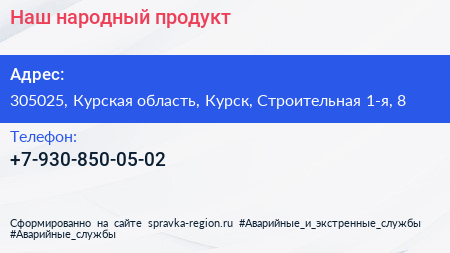 Наш народный продукт по адресу 305025, Курская область, Курск, Строительная 1-я, 8 в дальнейшем Организация, размещена в следующих категориях: