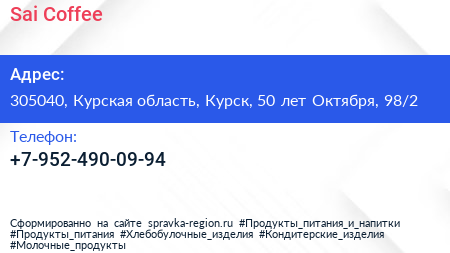 Sai Coffee по адресу 305040, Курская область, Курск, 50 лет Октября, 98/2 в дальнейшем Организация, размещена в следующих категориях: