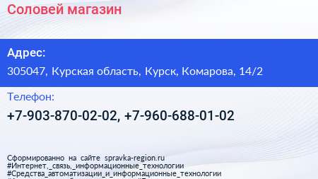 Соловей, магазин по адресу 305047, Курская область, Курск, Комарова, 14/2 в дальнейшем Организация, размещена в следующих категориях: