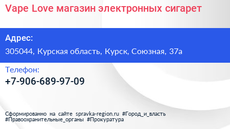 Vape Love, магазин электронных сигарет по адресу 305044, Курская область, Курск, Союзная, 37а в дальнейшем Организация, размещена в следующих категориях: