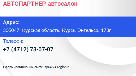 АВТОПАРТНЕР, автосалон по адресу 305047, Курская область, Курск, Энгельса, 173г в дальнейшем Организация, размещена в следующих категориях: