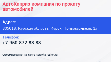 АвтоКаприз, компания по прокату автомобилей по адресу 305018, Курская область, Курск, Привокзальная, 1а в дальнейшем Организация, размещена в следующих категориях: