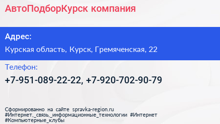 АвтоПодборКурск, компания по адресу Курская область, Курск, Гремяченская, 22 в дальнейшем Организация, размещена в следующих категориях: