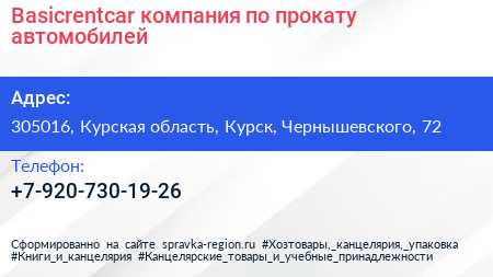 Basicrentcar, компания по прокату автомобилей по адресу 305016, Курская область, Курск, Чернышевского, 72 в дальнейшем Организация, размещена в следующих категориях: