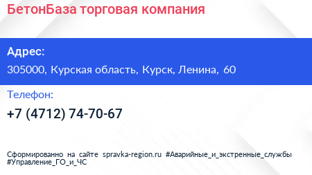БетонБаза, торговая компания по адресу 305000, Курская область, Курск, Ленина, 60 в дальнейшем Организация, размещена в следующих категориях: