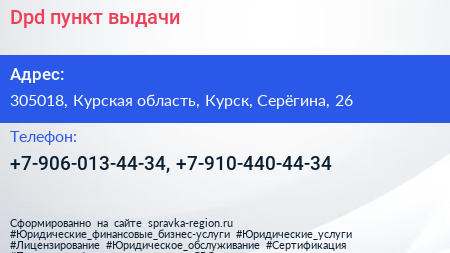 Dpd, пункт выдачи по адресу 305018, Курская область, Курск, Серёгина, 26 в дальнейшем Организация, размещена в следующих категориях:
