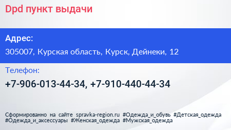 Dpd, пункт выдачи по адресу 305007, Курская область, Курск, Дейнеки, 12 в дальнейшем Организация, размещена в следующих категориях:
