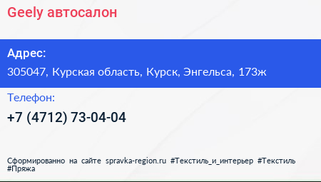 Geely, автосалон по адресу 305047, Курская область, Курск, Энгельса, 173ж в дальнейшем Организация, размещена в следующих категориях: