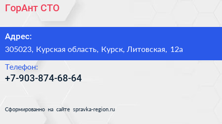 ГорАнт, СТО по адресу 305023, Курская область, Курск, Литовская, 12а в дальнейшем Организация, размещена в следующих категориях: