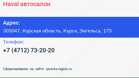 Haval, автосалон по адресу 305047, Курская область, Курск, Энгельса, 173 в дальнейшем Организация, размещена в следующих категориях: