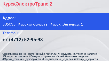 КурскЭлектроТранс №2 по адресу 305035, Курская область, Курск, Энгельса, 1 в дальнейшем Организация, размещена в следующих категориях: