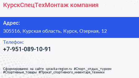 КурскСпецТехМонтаж, компания по адресу 305516, Курская область, Курск, Озерная, 12 в дальнейшем Организация, размещена в следующих категориях: