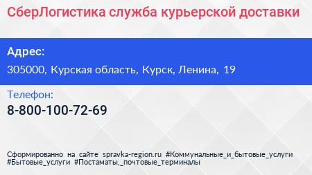 СберЛогистика, служба курьерской доставки по адресу 305000, Курская область, Курск, Ленина, 19 в дальнейшем Организация, размещена в следующих категориях: