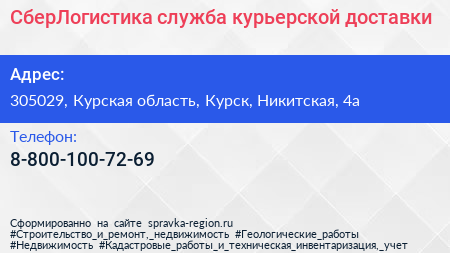 СберЛогистика, служба курьерской доставки по адресу 305029, Курская область, Курск, Никитская, 4а в дальнейшем Организация, размещена в следующих категориях:
