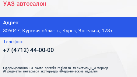 УАЗ, автосалон по адресу 305047, Курская область, Курск, Энгельса, 173з в дальнейшем Организация, размещена в следующих категориях:
