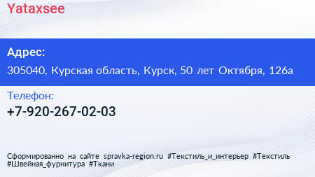 Yataxsee по адресу 305040, Курская область, Курск, 50 лет Октября, 126а в дальнейшем Организация, размещена в следующих категориях: