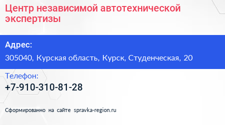 Центр независимой автотехнической экспертизы по адресу 305040, Курская область, Курск, Студенческая, 20 в дальнейшем Организация, размещена в следующих категориях:
