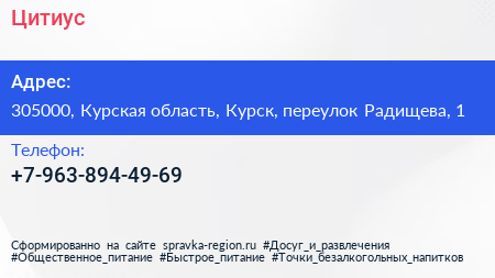 Цитиус по адресу 305000, Курская область, Курск, переулок Радищева, 1 в дальнейшем Организация, размещена в следующих категориях: