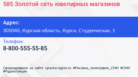 585 Золотой, сеть ювелирных магазинов по адресу 305040, Курская область, Курск, Студенческая, 1 в дальнейшем Организация, размещена в следующих категориях: