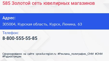 585 Золотой, сеть ювелирных магазинов по адресу 305004, Курская область, Курск, Ленина, 63 в дальнейшем Организация, размещена в следующих категориях: