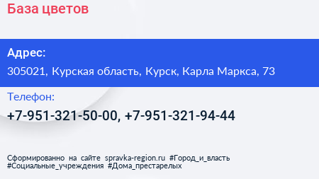 База цветов по адресу 305021, Курская область, Курск, Карла Маркса, 73 в дальнейшем Организация, размещена в следующих категориях: