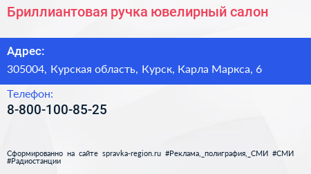 Бриллиантовая ручка, ювелирный салон по адресу 305004, Курская область, Курск, Карла Маркса, 6 в дальнейшем Организация, размещена в следующих категориях: