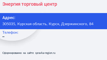 Энергия, торговый центр по адресу 305035, Курская область, Курск, Дзержинского, 84 в дальнейшем Организация, размещена в следующих категориях: