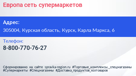 Европа, сеть супермаркетов по адресу 305004, Курская область, Курск, Карла Маркса, 6 в дальнейшем Организация, размещена в следующих категориях: