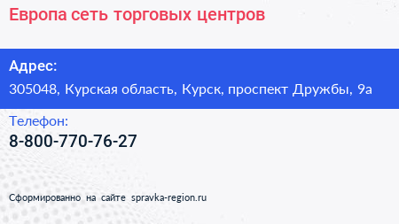 Европа, сеть торговых центров по адресу 305048, Курская область, Курск, проспект Дружбы, 9а в дальнейшем Организация, размещена в следующих категориях: