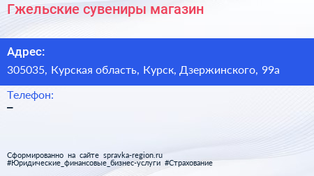 Гжельские сувениры, магазин по адресу 305035, Курская область, Курск, Дзержинского, 99а в дальнейшем Организация, размещена в следующих категориях:
