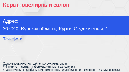 Карат, ювелирный салон по адресу 305040, Курская область, Курск, Студенческая, 1 в дальнейшем Организация, размещена в следующих категориях: