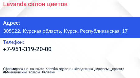 Lavanda, салон цветов по адресу 305022, Курская область, Курск, Республиканская, 17 в дальнейшем Организация, размещена в следующих категориях: