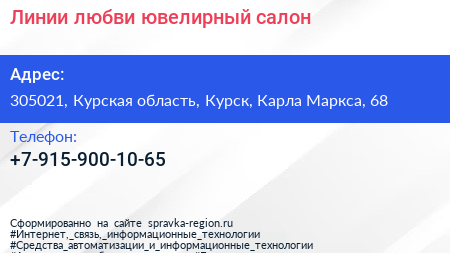 Линии любви, ювелирный салон по адресу 305021, Курская область, Курск, Карла Маркса, 68 в дальнейшем Организация, размещена в следующих категориях: