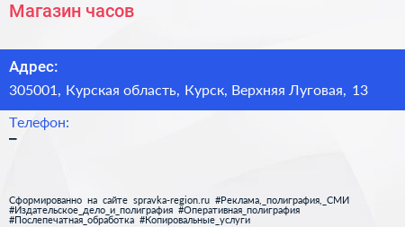 Магазин часов по адресу 305001, Курская область, Курск, Верхняя Луговая, 13 в дальнейшем Организация, размещена в следующих категориях: