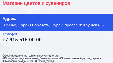 Магазин цветов и сувениров по адресу 305048, Курская область, Курск, проспект Хрущёва, 5 в дальнейшем Организация, размещена в следующих категориях: