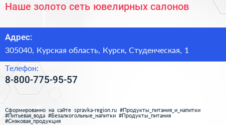 Наше золото, сеть ювелирных салонов по адресу 305040, Курская область, Курск, Студенческая, 1 в дальнейшем Организация, размещена в следующих категориях: