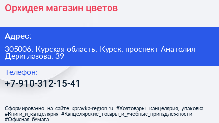 Орхидея, магазин цветов по адресу 305006, Курская область, Курск, проспект Анатолия Дериглазова, 39 в дальнейшем Организация, размещена в следующих категориях: