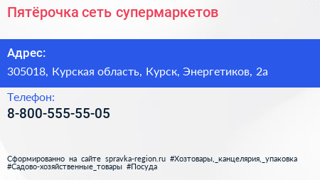 Пятёрочка, сеть супермаркетов по адресу 305018, Курская область, Курск, Энергетиков, 2а в дальнейшем Организация, размещена в следующих категориях: