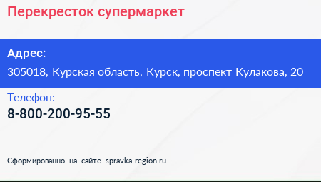 Перекресток, супермаркет по адресу 305018, Курская область, Курск, проспект Кулакова, 20 в дальнейшем Организация, размещена в следующих категориях: