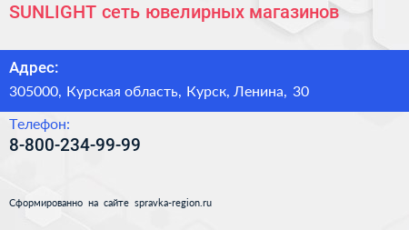 SUNLIGHT, сеть ювелирных магазинов по адресу 305000, Курская область, Курск, Ленина, 30 в дальнейшем Организация, размещена в следующих категориях: