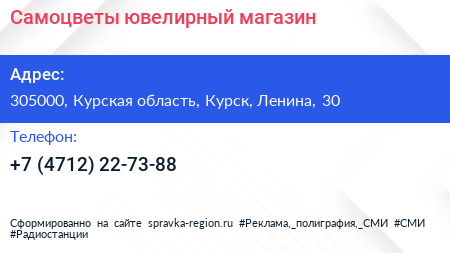 Самоцветы, ювелирный магазин по адресу 305000, Курская область, Курск, Ленина, 30 в дальнейшем Организация, размещена в следующих категориях: