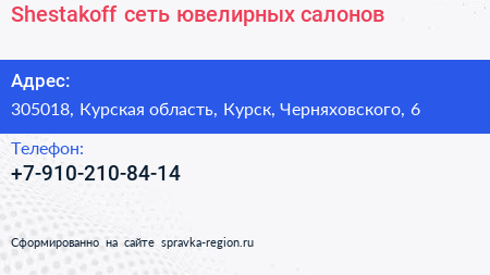 Shestakoff, сеть ювелирных салонов по адресу 305018, Курская область, Курск, Черняховского, 6 в дальнейшем Организация, размещена в следующих категориях: