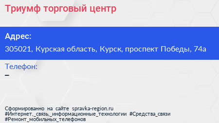 Триумф, торговый центр по адресу 305021, Курская область, Курск, проспект Победы, 74а в дальнейшем Организация, размещена в следующих категориях: