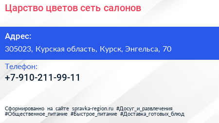 Царство цветов, сеть салонов по адресу 305023, Курская область, Курск, Энгельса, 70 в дальнейшем Организация, размещена в следующих категориях: