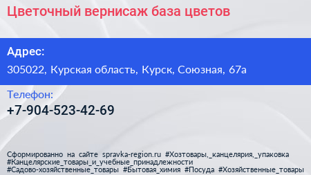 Цветочный вернисаж, база цветов по адресу 305022, Курская область, Курск, Союзная, 67а в дальнейшем Организация, размещена в следующих категориях:
