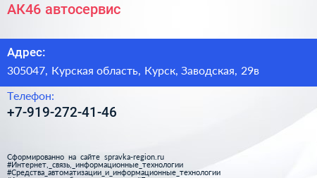 АК46, автосервис по адресу 305047, Курская область, Курск, Заводская, 29в в дальнейшем Организация, размещена в следующих категориях: