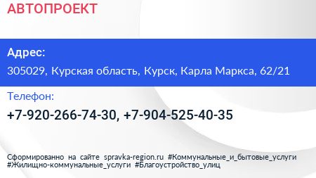 АВТОПРОЕКТ по адресу 305029, Курская область, Курск, Карла Маркса, 62/21 в дальнейшем Организация, размещена в следующих категориях: